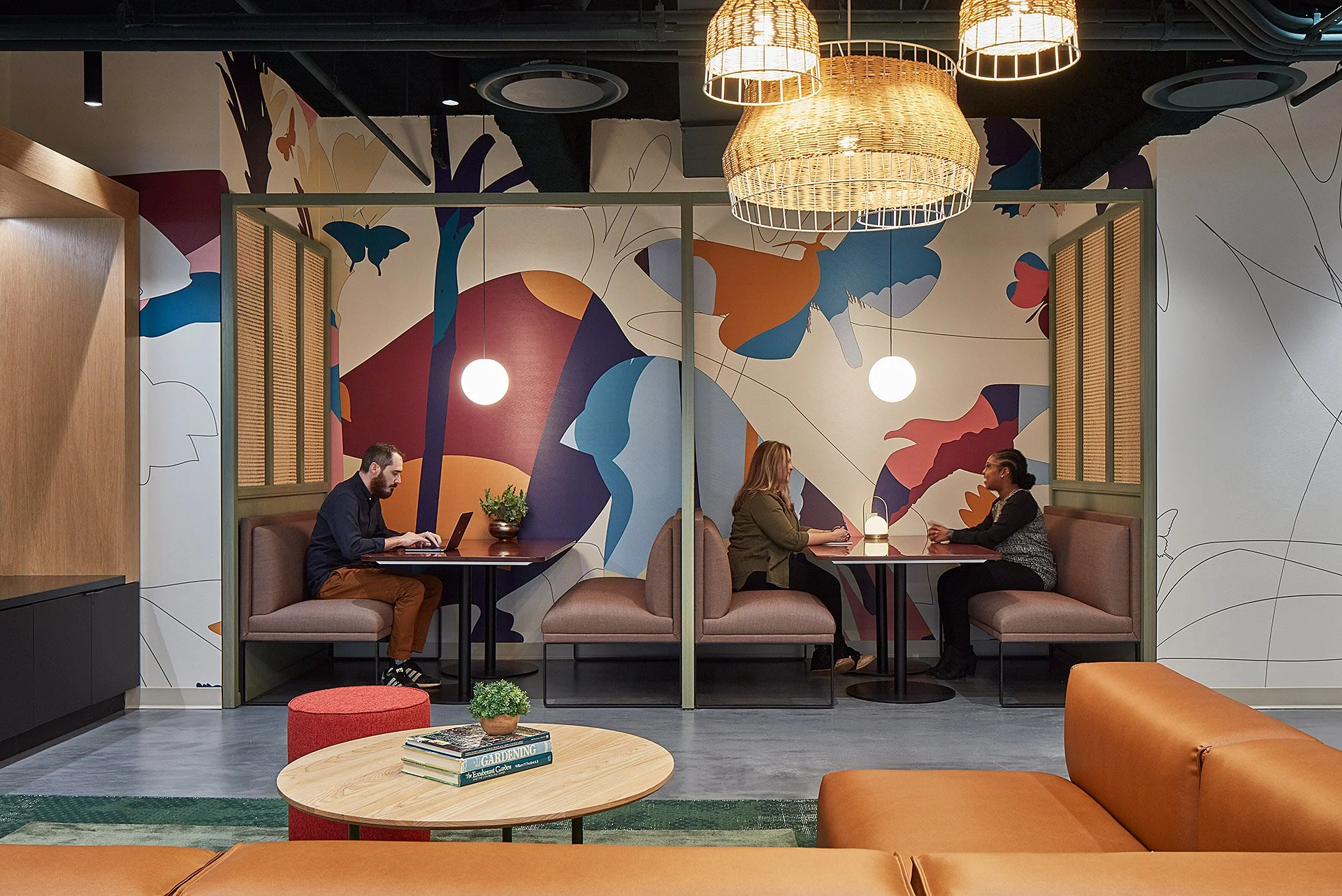 Banquette and booth seating offer power to these alternative workpoints, while vibrant textiles create a lush palette indicative of a lagoon.