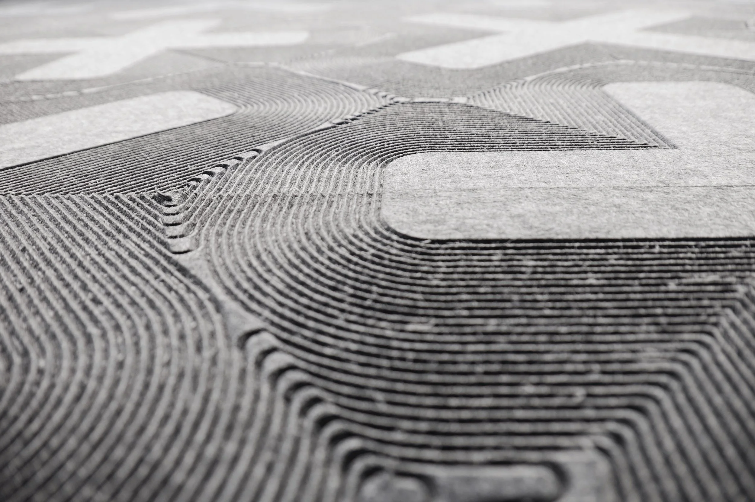 Innovative materials were also explored, such as using sustainable ink procured from algae to print conference room graphics. Most notably, the first floor events and community center installed automotive trunk lining with a routed design, creating an acoustic floor to ceiling graphic, and because it was routed, the surface area increased the sound absorption to be higher than a typical felt panel.