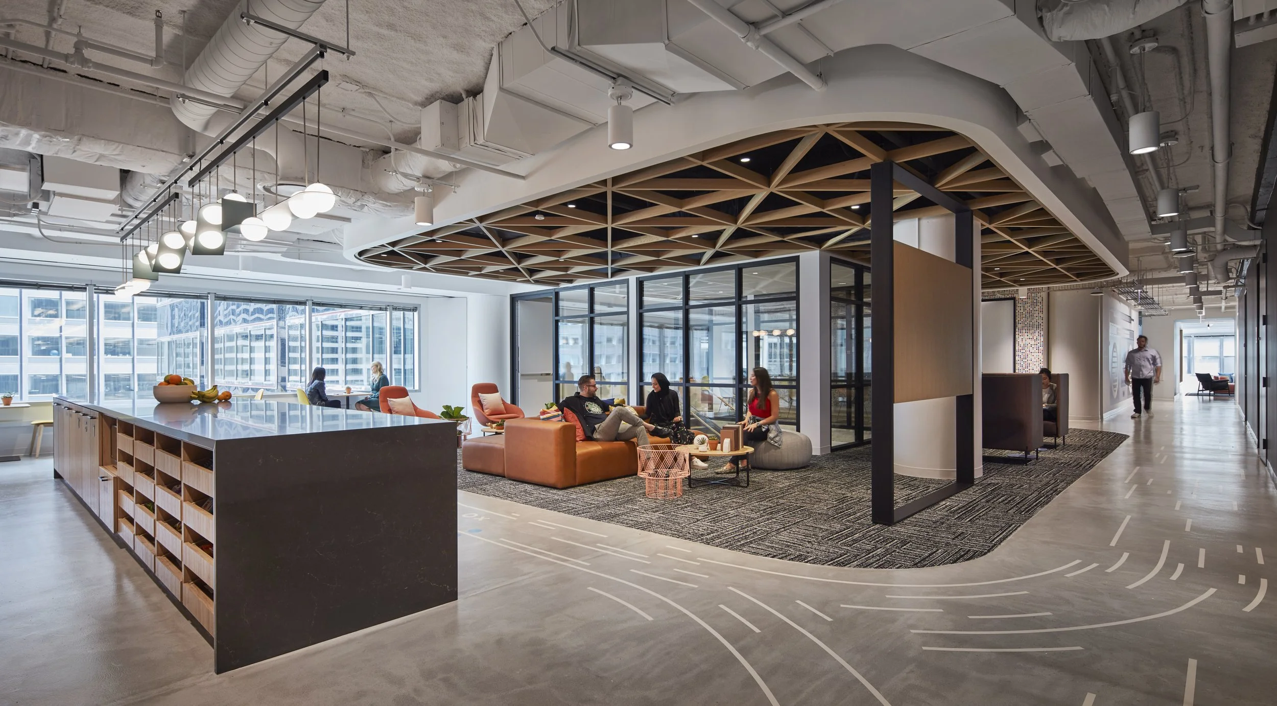 Z-shaped floor plates posed a circulation challenge in connecting northwest neighborhoods and teams to southeast portion of the campus, while strategically programming amenities throughout with equitable employee access. This unique ambulatory hurdle created opportunities to carve out intentional activations for collaboration or focus work away from standard workstations and high volume teams.